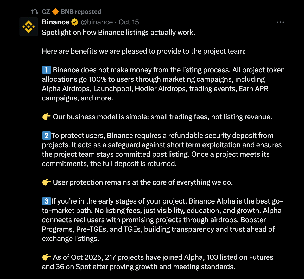 - "Binance does not profit from the listing process" - Token allocations go to users, not the exchange
