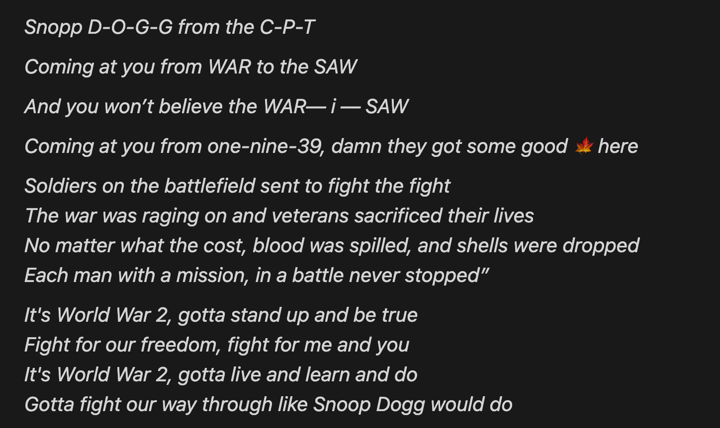 I don’t need a theoretical Ph.D. in Cold War Military Tactics to ask ChatGPT, “Write a Snoop Dogg rap about World War 2”