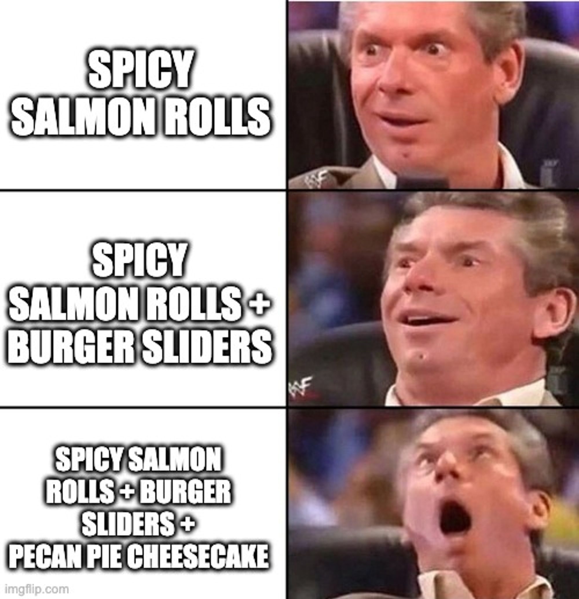 Some spicy salmon rolls, some fajitas, some burger sliders, and…slurp… definitely some pecan pie cheesecake. 😍