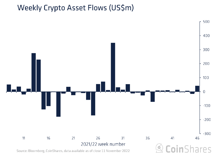 Despite the horrific noise around FTX, CoinShares analysts reported, that "digital asset investment products saw the largest inflows for 14 weeks totaling $42m".