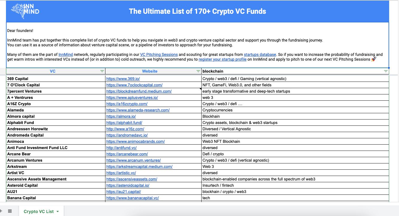 To support startup founders during this challenging time, InnMind team has put together the ultimate list of venture capital firms, that invest in blockchain, crypto and web3 startups. There are more than 165 crypto VC funds that were active in this sector during the last year, and this list will grow since we're going to update it regularly 👇